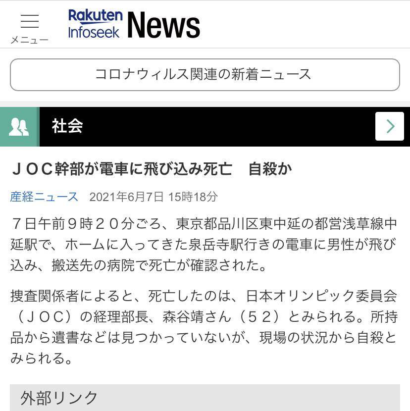 Joc経理部長 : R3ttytaq0farym. 【動画】ニュース番組さん、joc経理部長自殺ニュースを急遽「ゾウが車に猛突進」に差し替え 2021.06.08 |カテゴリ: ニュース | コメント (24) 1: Jocについて jocの理念 評議員名簿 役員名簿 会長の略歴 組織機構図 所在地 年表 業務・財務 マーケティング マーク・エンブレム jocスポンサー リコグニション 加盟団体一覧 jocパートナー都市 スポーツ宣言日本 暴力行為根絶宣言 選手等を対象にした通報. 「東京オリンピック直前、いったい何があったのでしょうか。jocの幹部が.。失礼しました。続いてのニュース、改めましてお伝えします。破壊されたボンネットが(略)」 ・恐ろしいことやねえ… ・前スレ荒らされてて草 ・ソース、なし!w ・直接はマルチポストではれんかったわ ・これ. Joc経理部長自殺か 都営地下鉄にはねられる 2021年6月8日 05:30 社会 小池都知事 1回目のワクチン接種済ませる 体調は「okです」 ネトウヨ ★ 2021/06/07(月) 14:19:30.44 id:zzrrwuh59 7日朝、東京・品川区の都営地下鉄・浅草線の駅で、joc(=日本オリンピック委員会) 幹部の50代の男性職員が電車に飛び込み死亡しました。自殺とみら